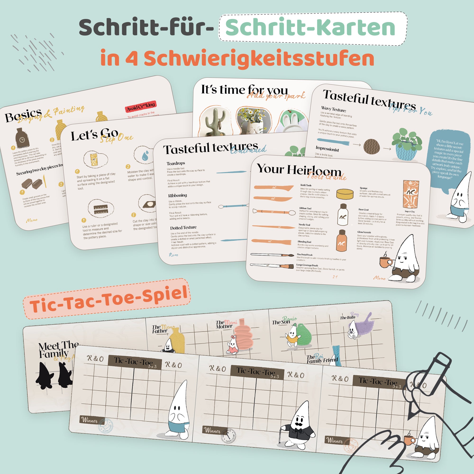 · ❤️ Inklusive Anleitung & Spielidee – Schritt-für-Schritt-Guide erleichtert den Einstieg ins Töpfern zuhause. Zusätzlich: eine liebevolle Willkommenskarte mit kleinem Spiel (Tic-Tac-Toe) für kreative Abende allein, zu zweit oder mit der Familie.