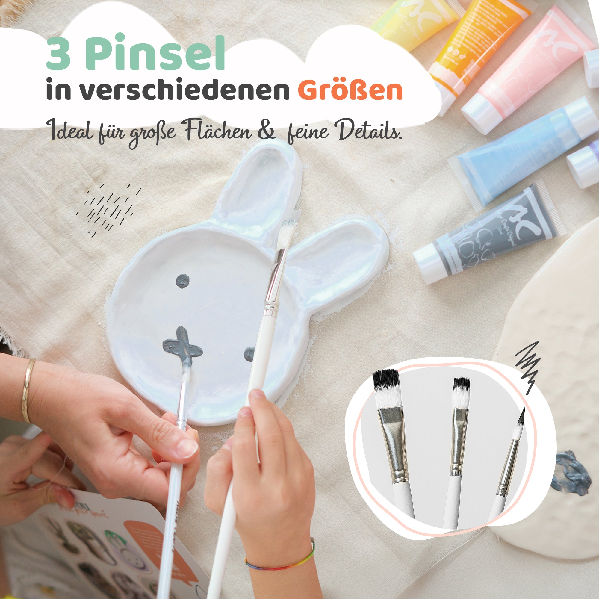 · 🎨 Farben & Pinsel für brillante Ergebnisse – Acrylfarben-Set mit 8 intensiven Tönen, 3 Pinseln und weißer Grundierung & Gloss Varnisch. Die Farben sind deckend, langlebig und perfekt geeignet, um Keramik oder Modelliermasse Lufttrocknend zu bemalen – für ein professionelles Finish.